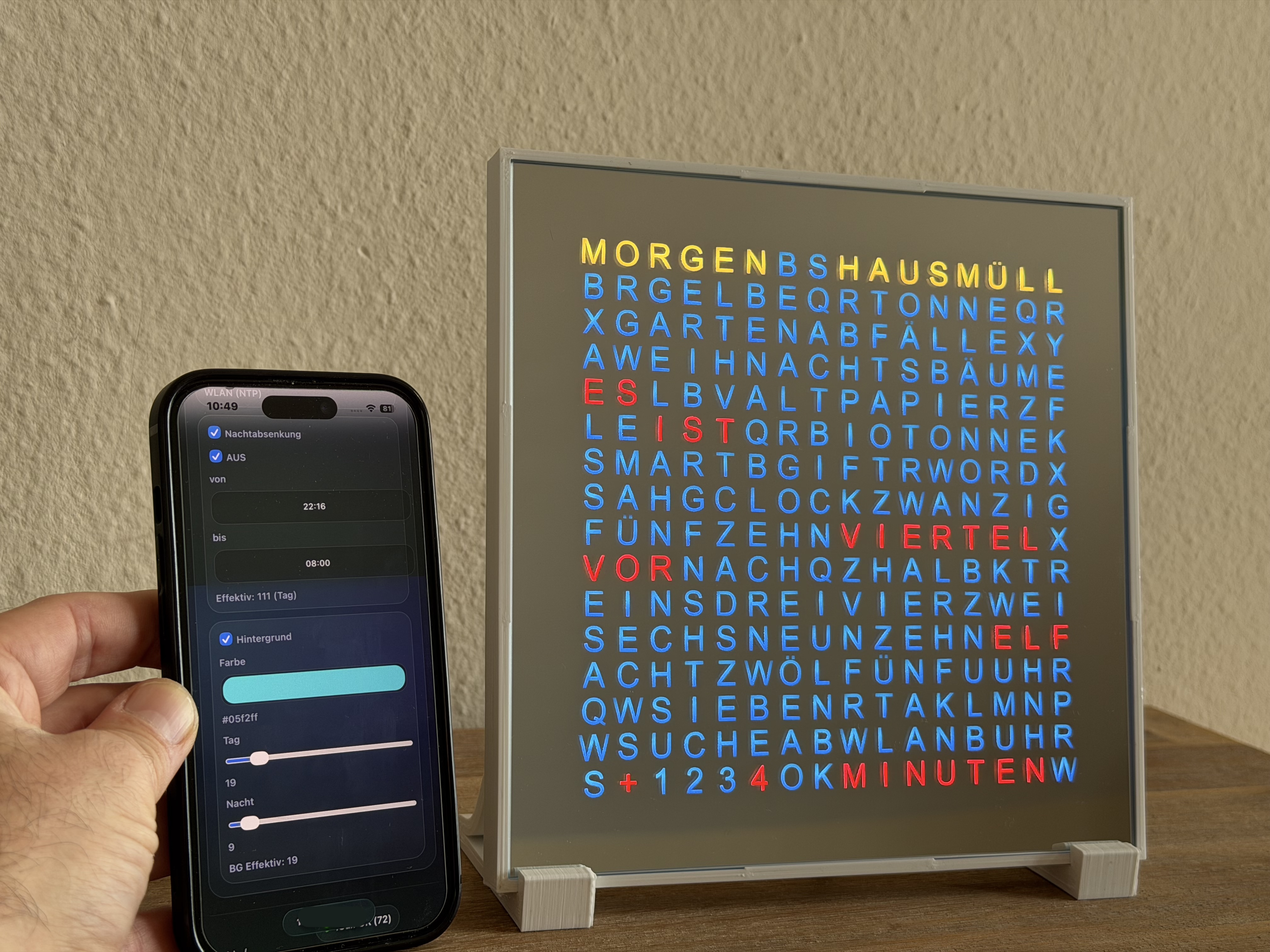 Passe Farben, Helligkeit und Funktionen in Echtzeit an. Die Smart-Gift WordClock verbindet Design mit echter Funktionalität.
